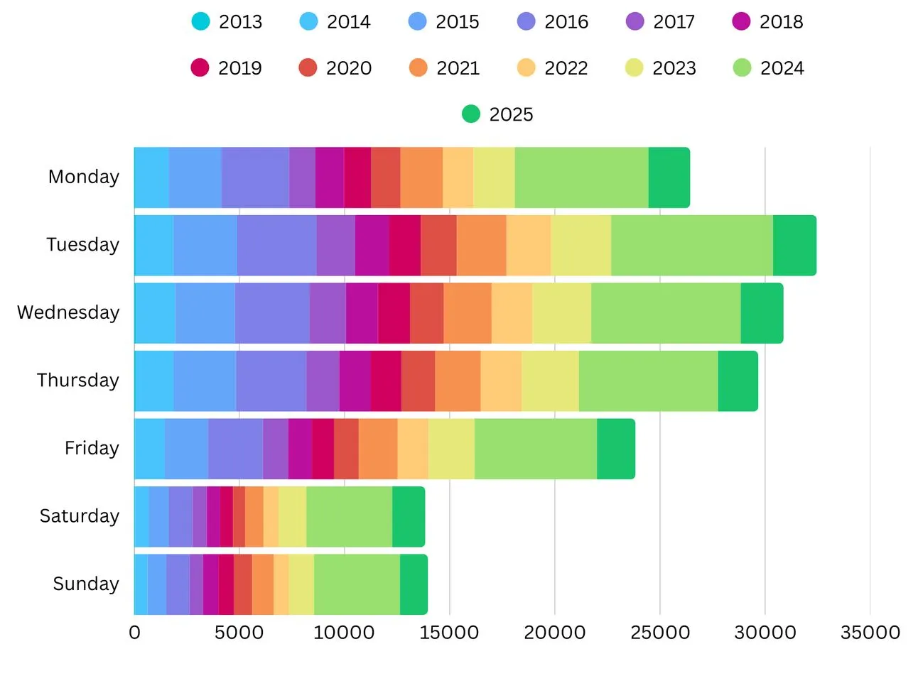 Total number of Product Hunt launches by weekday