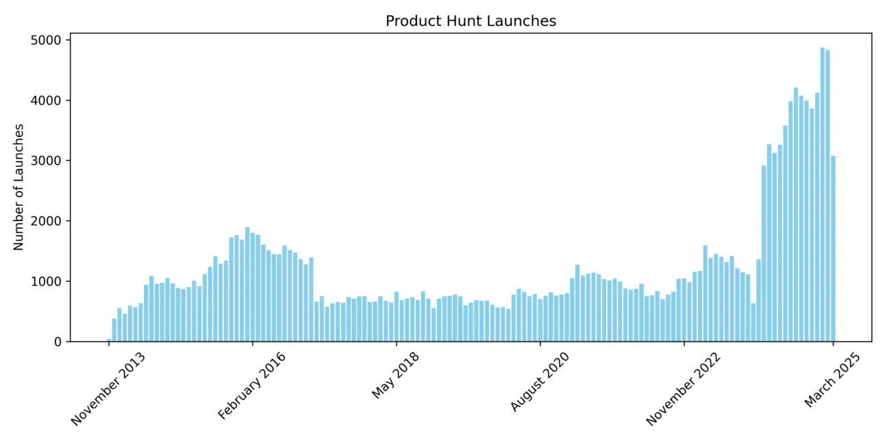 Monthly Product Hunt launches over time, showing the sharp increase starting in early 2024