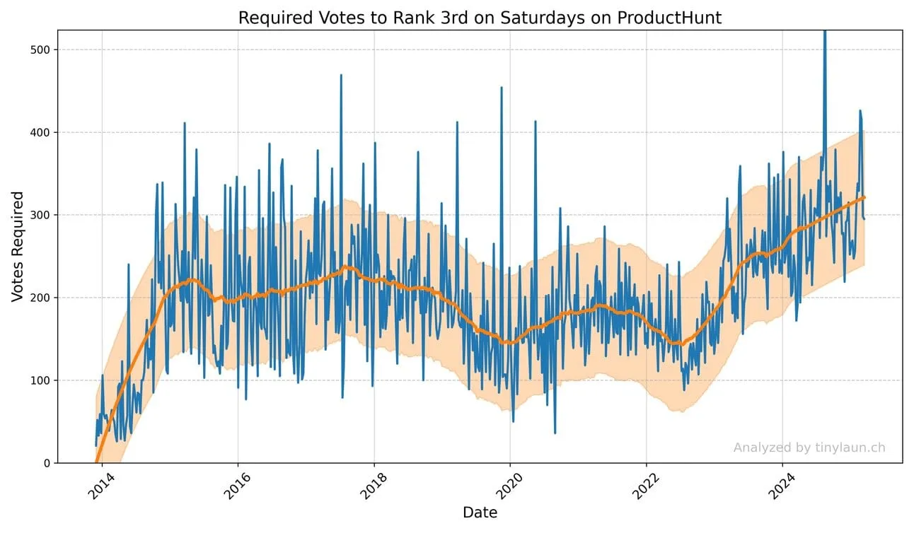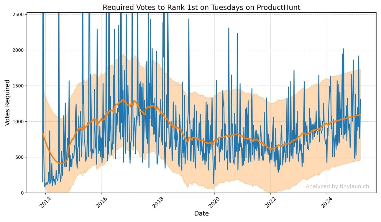 Upvotes required to rank #1 on a Tuesday, tracked over time