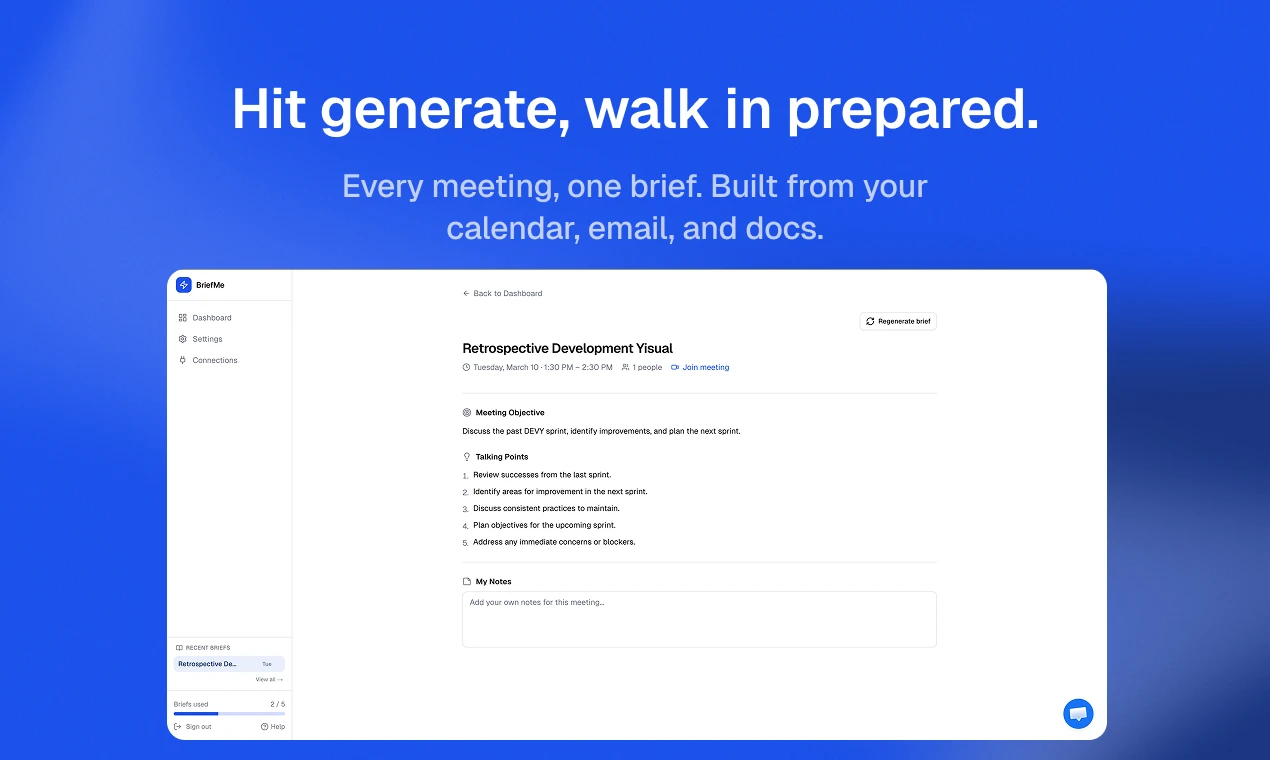 AI-generated meeting briefs. Ready in 30 seconds.
