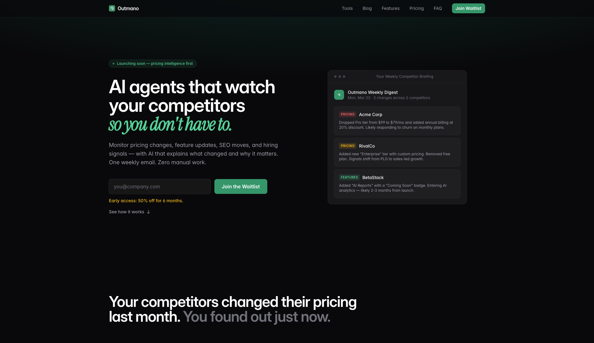 Track competitor pricing, features, SEO, and hiring with AI